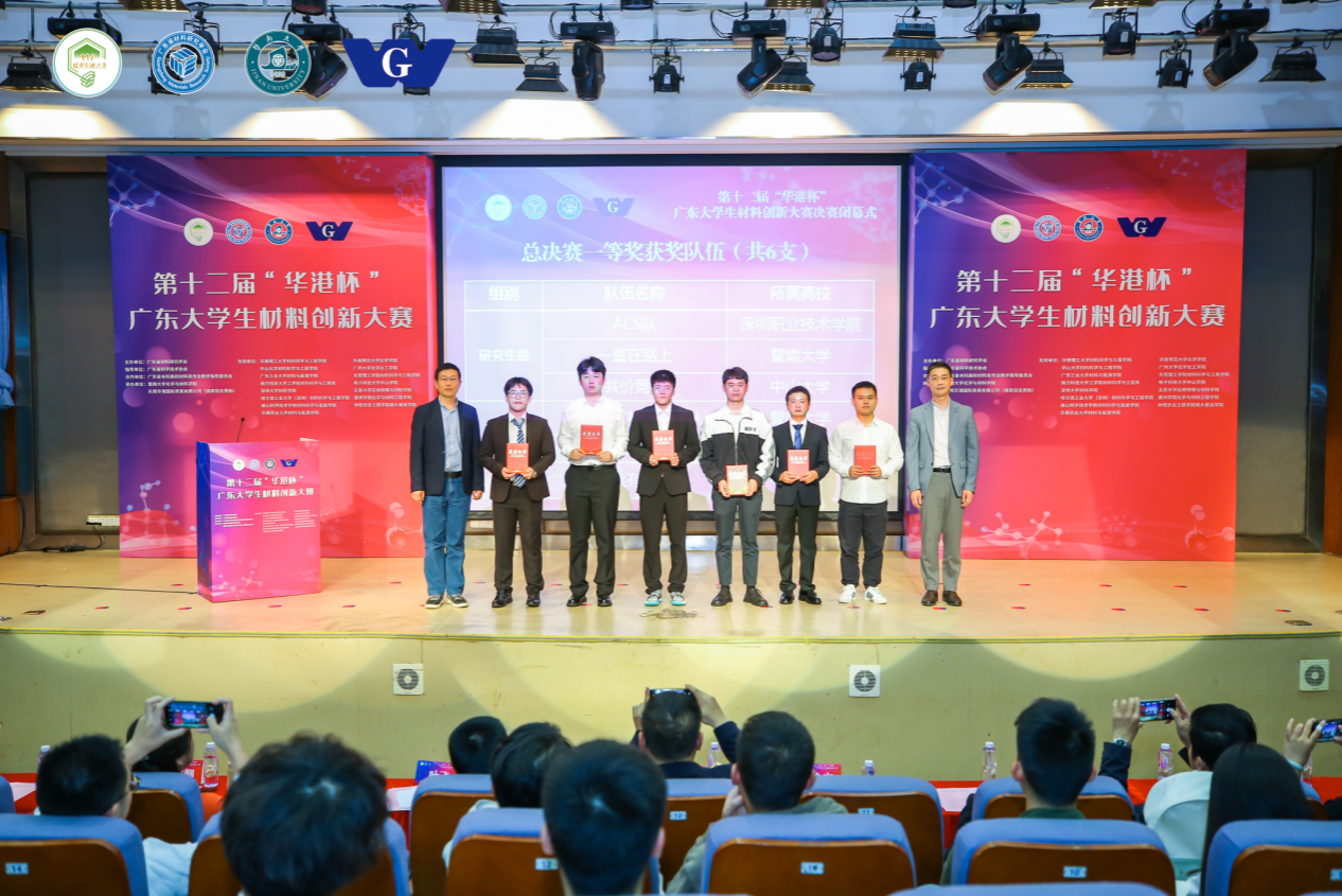 On March 25-26, the Grand Final of the 12th“Huagang Cup” Guangdong College Students Materials Innovation Competition, sponsored by Guangdong Materials Research Society, co-sponsored by Guangdong Undergraduate Materials Teaching Steering Committee, and co-organized byCollege of Chemistry and Materials Science,Jinan University, and Dongguan Huagang International Trading Co., Ltd., was held in Jinan University, Guangzhou. SZPT ACS Team, comprising graduate students of combined training, including Yu Liang (team leader), Miao Jiafeng, Mao Shanshan, Li Xingyu, and Ji Yaxiong, and instructed by Wang Hao, Associate Research Fellow of Hoffmann Institute of Advanced Materials,as the only team from higher vocational colleges participating in the competition, won the first prize in the final of the inorganic non-metallic materials segment and the grand final of the competition, and Wang Hao won the honorary title of “Excellent Instructor”.
